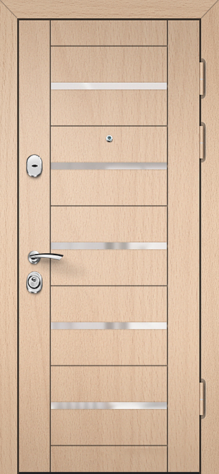 Эта бронированная дверь в современном дизайне №28 станет отличным решением для частного дома, квартиры или офиса, предлагая надежную защиту и стильный внешний вид. Ее конструкция включает каркас из профильной трубы 50х25 мм и металлическое полотно толщиной 2 мм, что обеспечивает прочность и долговечность. Внешняя и внутренняя отделка выполнены из плиты МДФ, придающей двери современный вид и стойкость к механическим повреждениям. Хотя терморазрыв отсутствует, конструкция с терморазрывом коробки и полотна помогает снижать теплопотери. Дополнительную безопасность обеспечивают два замка — сувальдный и цилиндровый, оба с тремя ригелями. В дверь можно добавить зеркало, стеклопакет или кованые элементы, а также установить видеодомофон, что делает эту модель максимально универсальной и индивидуальной. Бронированная дверь в современном дизайне №28 от производителя: быстрое изготовление и монтаж в Ожерелье, индивидуальные размеры, широкий выбор материалов и фурнитуры, официальная гарантия до 10 лет.
